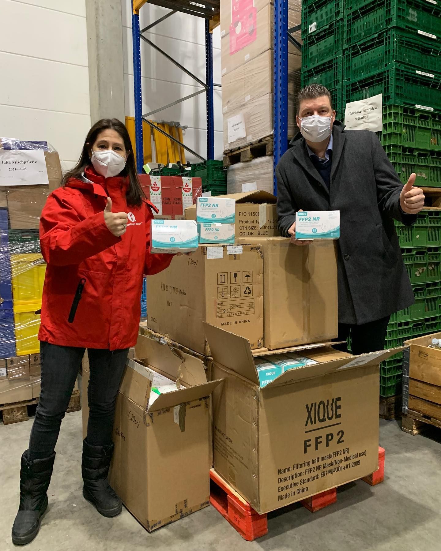 Ein Lächeln auf und unter der Maske: Bereichsleiterin Petra Fuhrmann und Sandra Dausend, Leiterin der Essener Bahnhofsmission (von links), freuen sich über 500 FFP2 Masken für Menschen in Not☺️❤️ #sc…