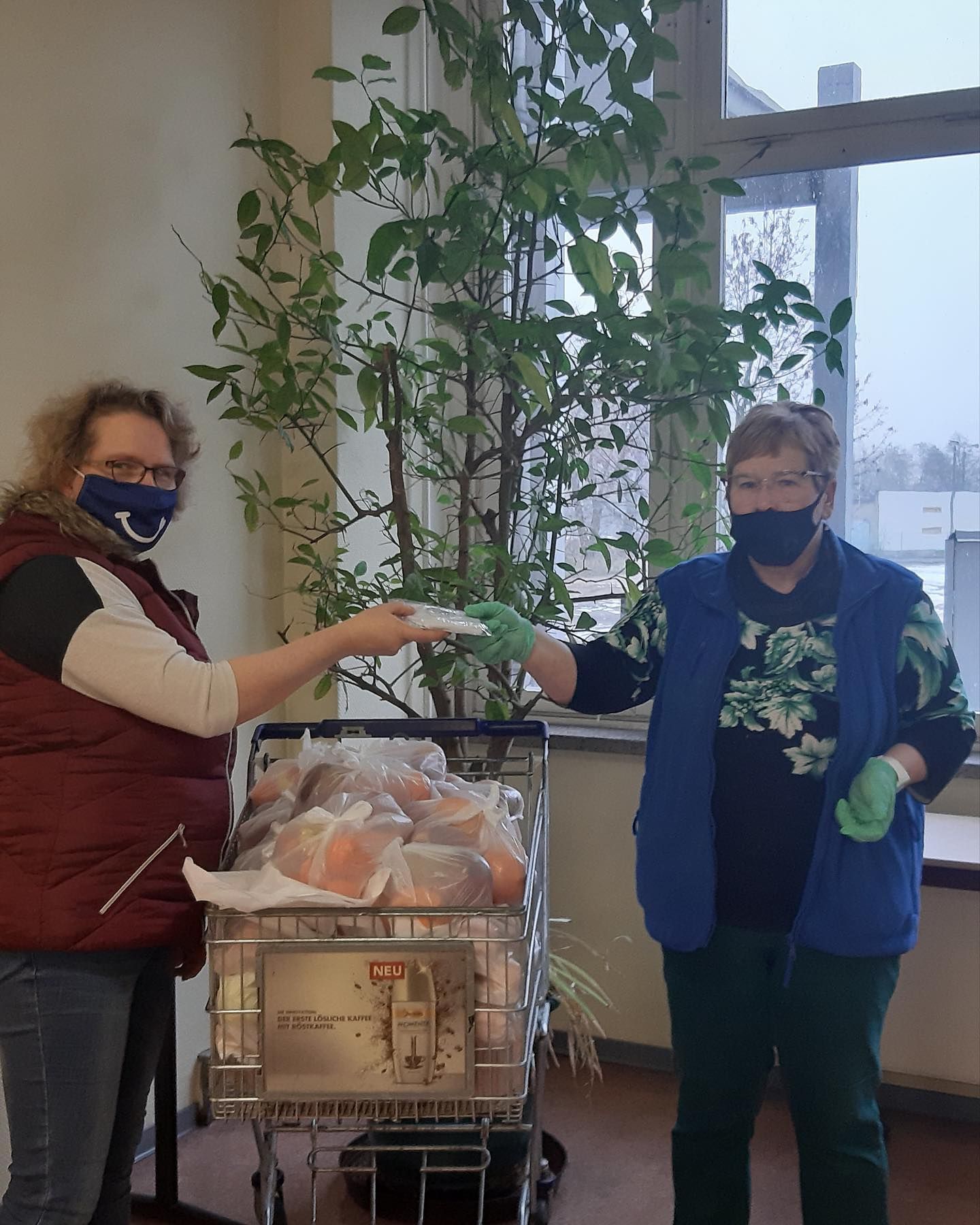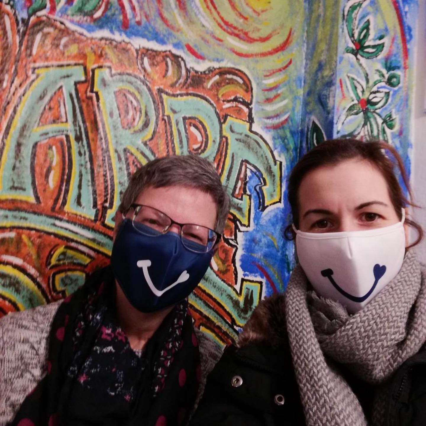 Ein Lächeln auf und unter der Maske: Bereichsleiterin Petra Fuhrmann und Sandra Dausend, Leiterin der Essener Bahnhofsmission (von links), freuen sich über 500 FFP2 Masken für Menschen in Not☺️❤️ #sc…